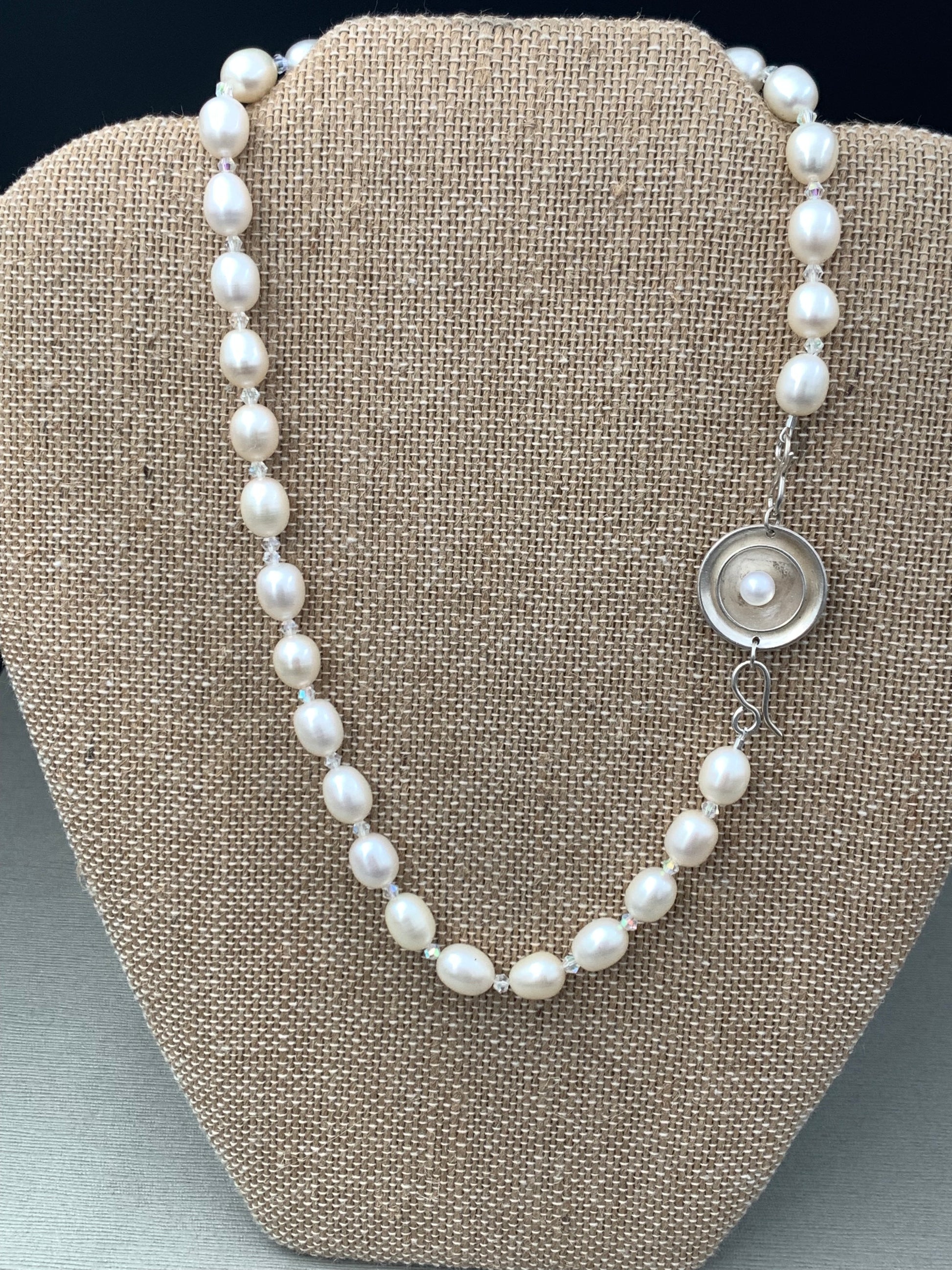 17" Freshwater Pearl and ABS Swarovski Crystal Necklace with handcrafted Silver Pearl Clasp