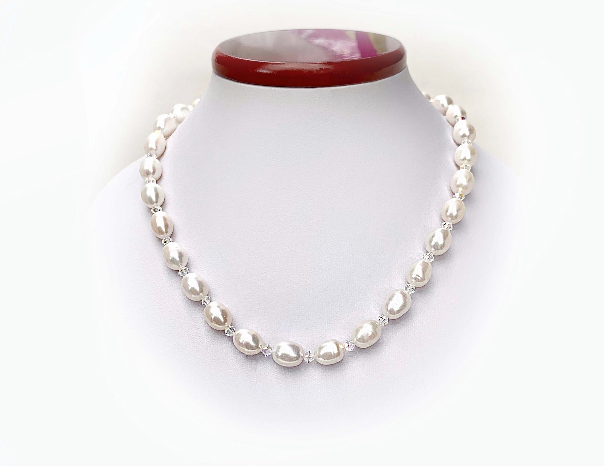 Handcrafted White Freshwater Pearls team up with genuine sparkly ABS Swarovski crystals to give this necklace the inner glow of pearls plus a pop of sparkle. A focal clasp has been added to complete the look of timeless elegance.