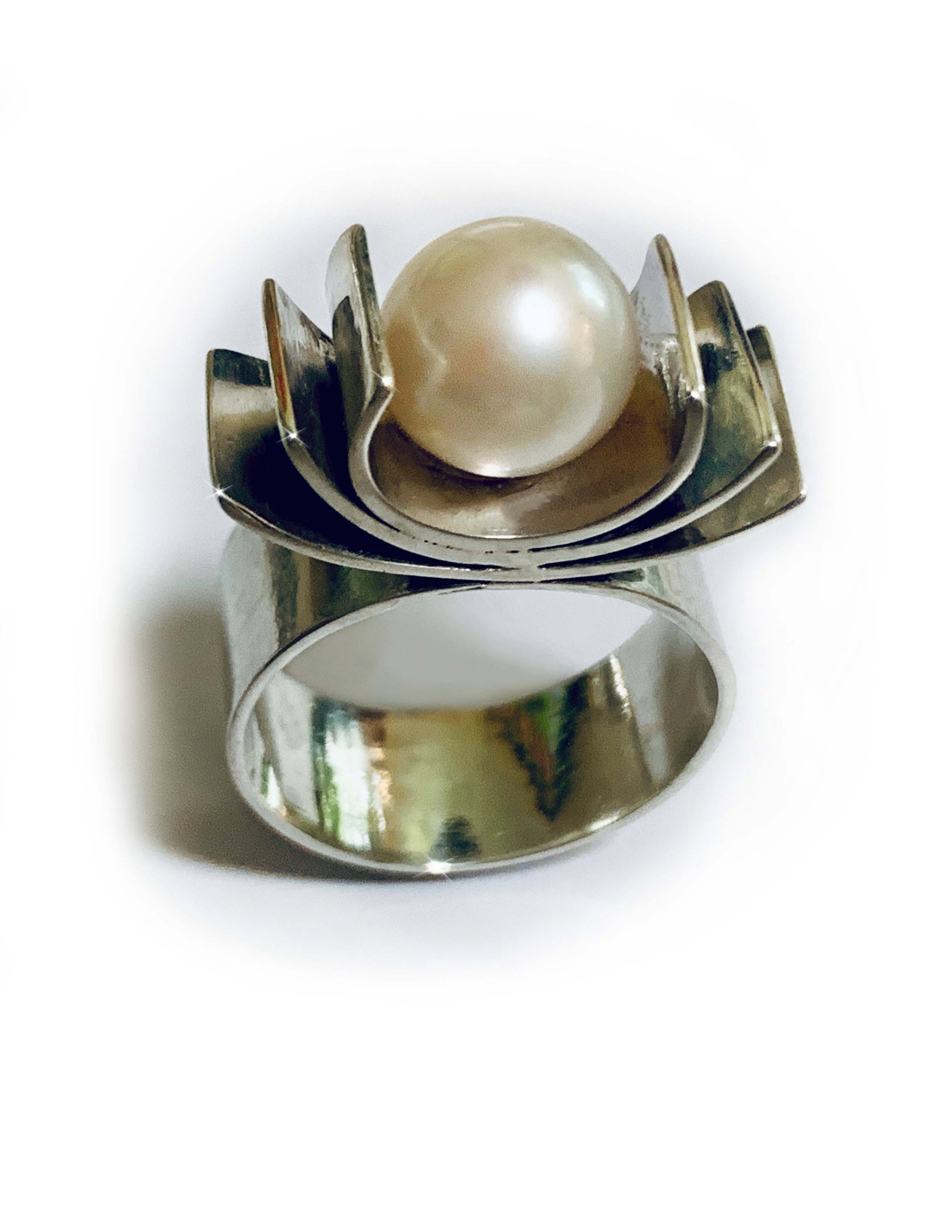 Dramatic Modern Sterling Silver Ring with White Pearl