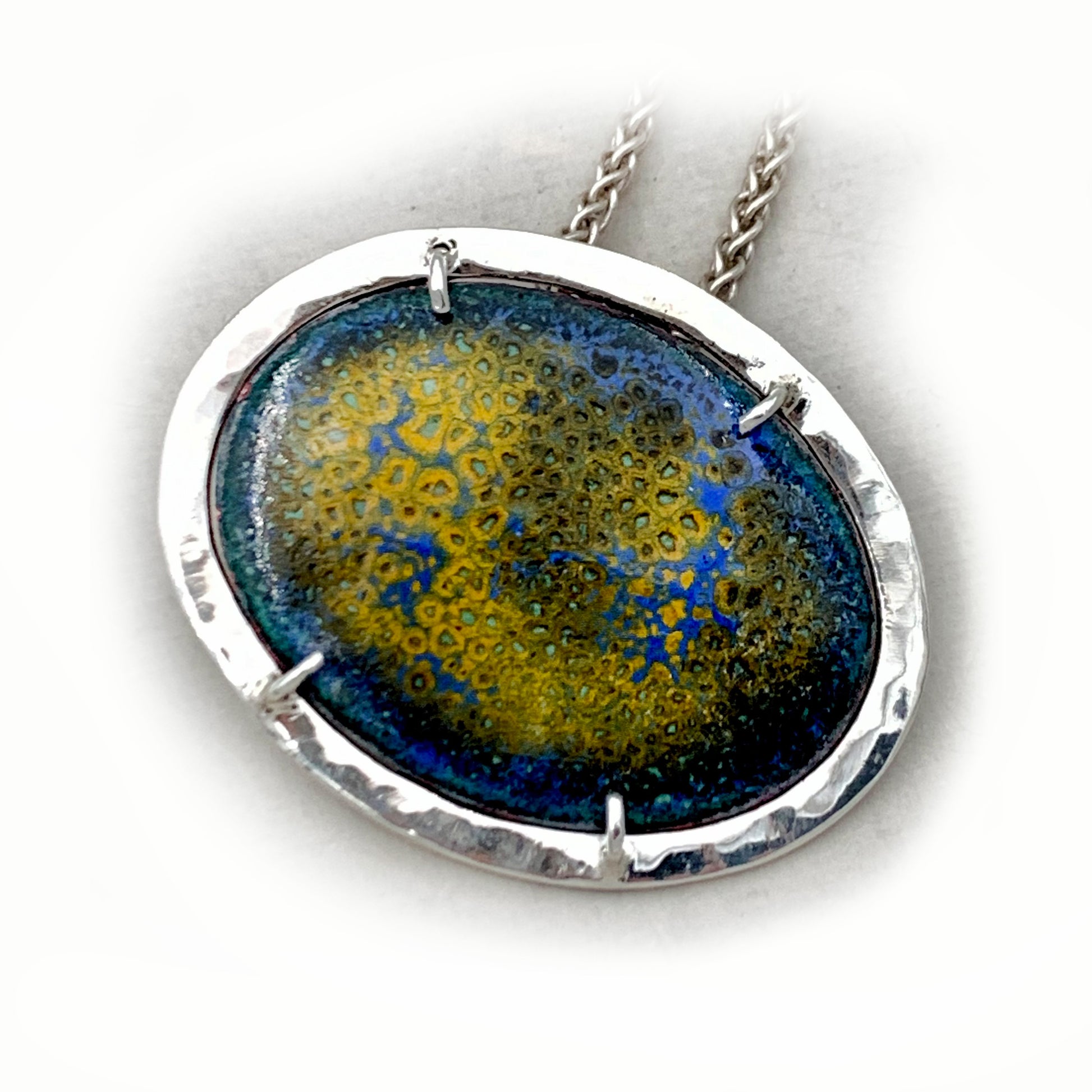Sterling Silver Pendant Necklace featuring Handcrafted Blue and Gold Crackle Enamel