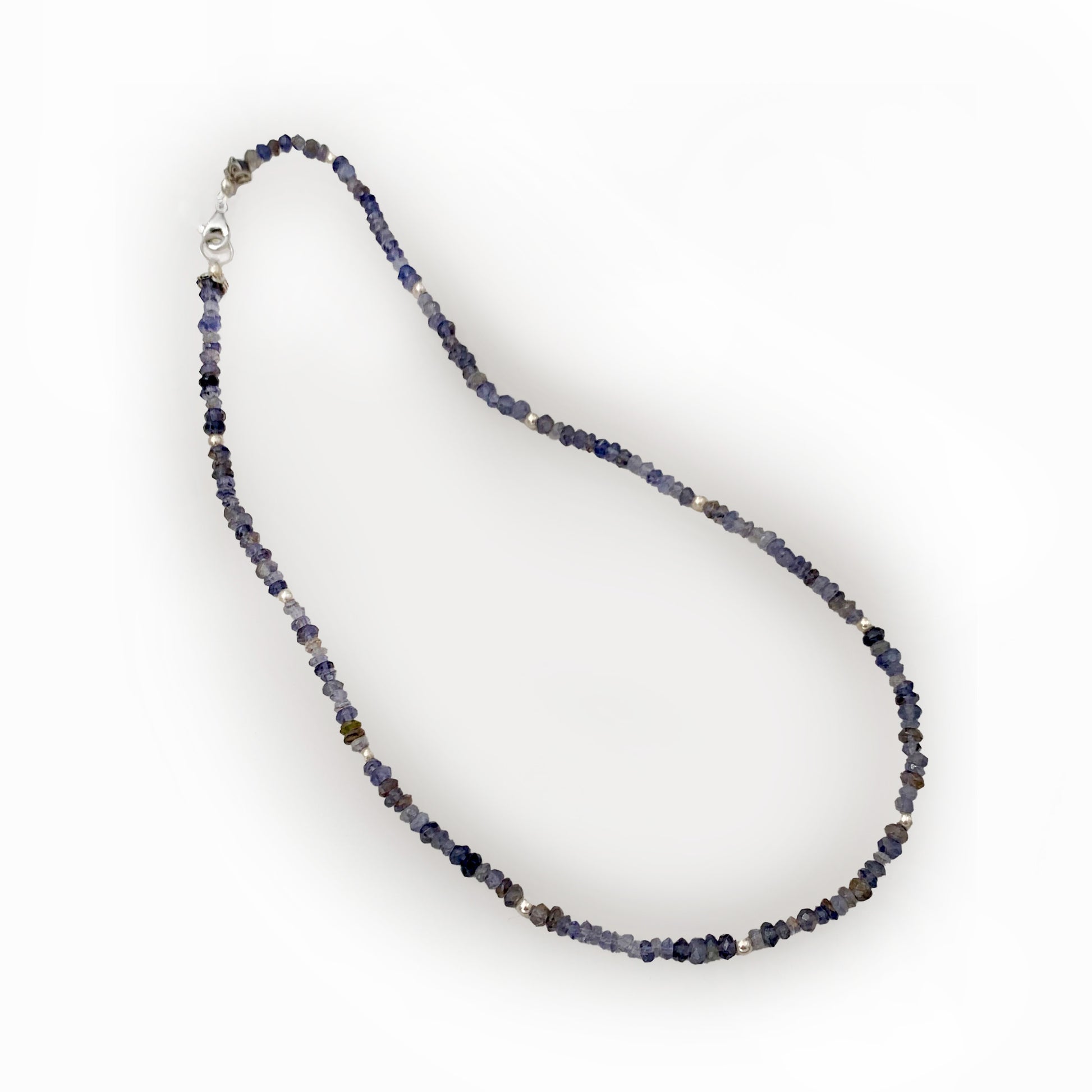 This Handcrafted Sterling Silver and Faceted Iolite Gemstone Bead Necklace is 16" long. The Iolite gemstone beads are 3 -3.5 milimeters in diameter and range in colour from dark to medium violet. Sterling silver beads have been added at intervals to add brightness and complement the secure Sterling Silver Lobster Clasp.