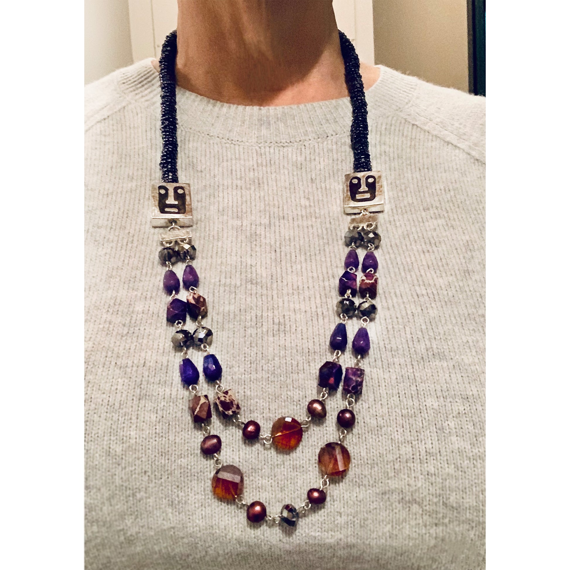 This striking Handcrafted 30" Necklace is made from Purple Jasper faceted stone beads, burgundy dyed freshwater pearls, amethyst faceted stone beads, and crystal beads. The Tribal / Picasso Mask elements are handmade hollow forms of sterling silver and the facial details are reversible. The top of the necklace is woven seed beads, while the lower part of the necklace is connected by sterling silver wire.