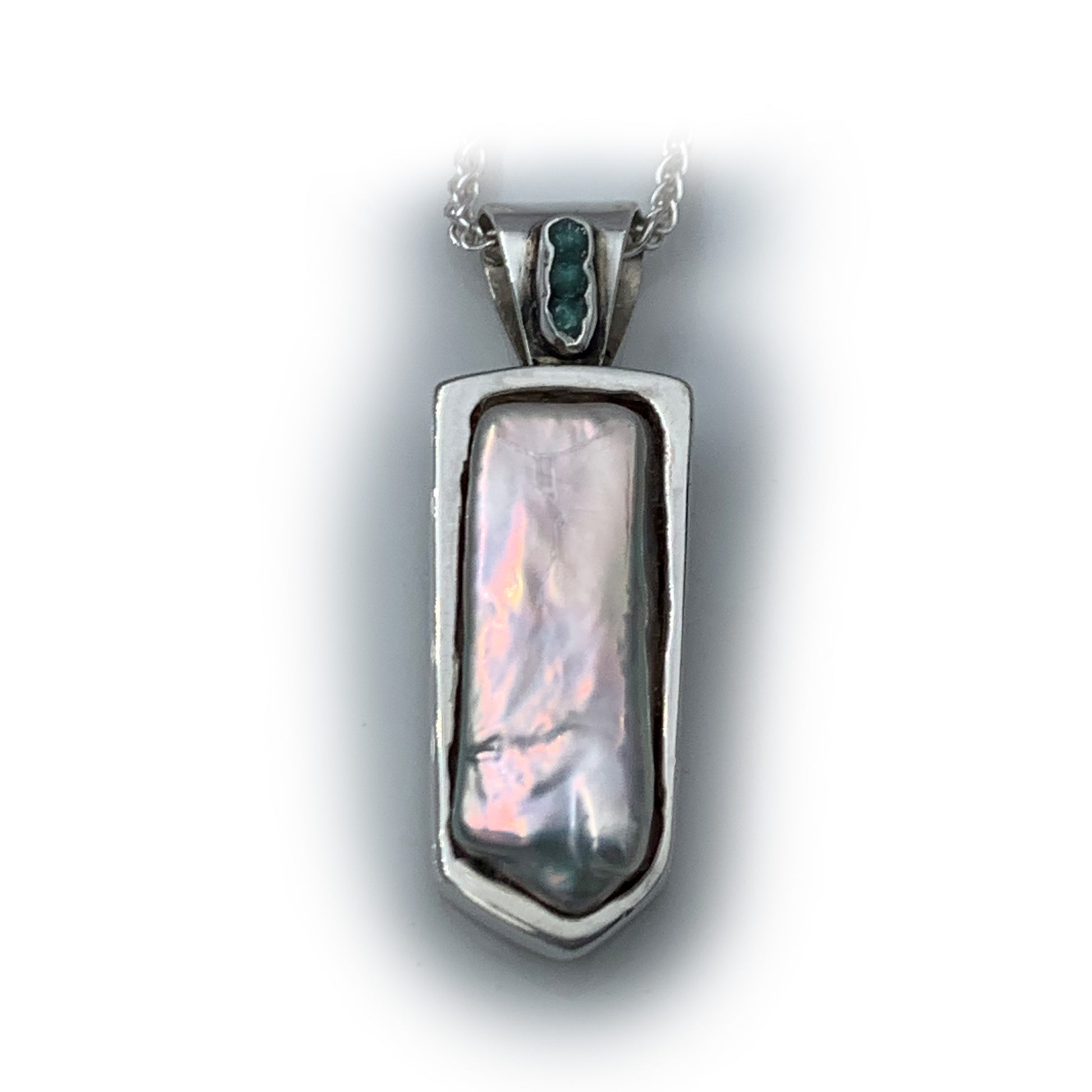 Handcrafted Sterling Silver Pendant with a large White Freshwater Pearl and three genuine Rough blue Diamonds: this necklace has a modern twist on a classic look.