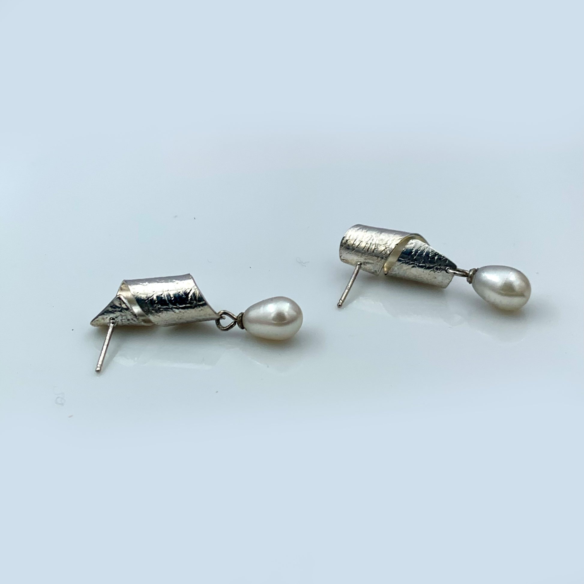 These elegant Post style earrings feature Teardrop white baroque pearls suspended from a spiralling silver column. The textured silver contrasts beautifully with the organic shape and luminous luster of the baroque pearls, creating a sophisticated yet modern look.